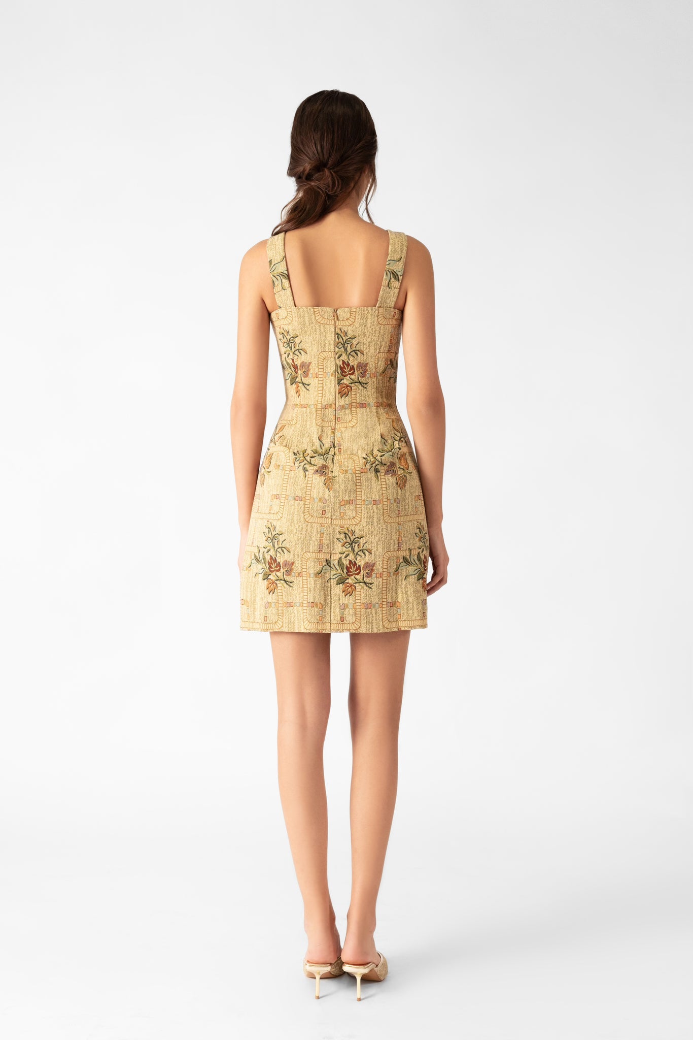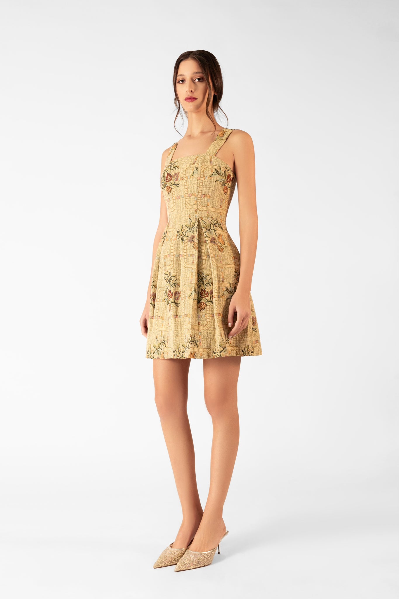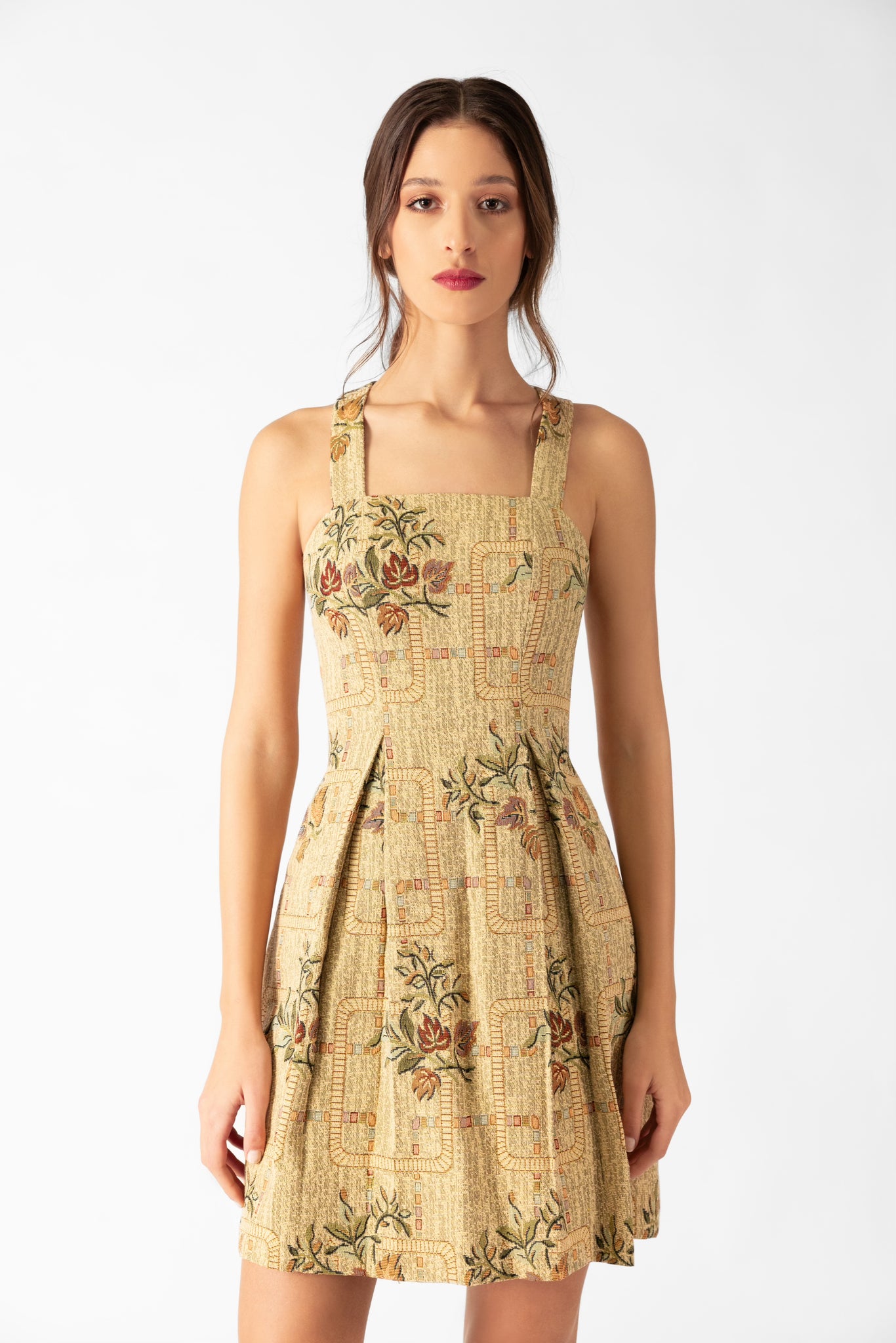 A timeless A-line mini dress made from Damasco tapestry. Delicate floral motifs and a sun-faded palette evoke the luminous elegance of desert sands.